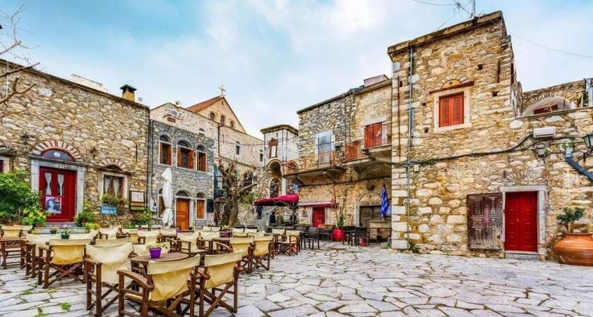 Ardından, Orta Çağ’dan günümüze en iyi korunmuş kale-köylerden biri olan Mesta’yı ziyaret ediyoruz. Labirenti andıran dar sokaklarında yürüyüş yapıyor, köy meydanında kahve molası veriyor ve Taksiarchis Kilisesi’ni görüyoruz.